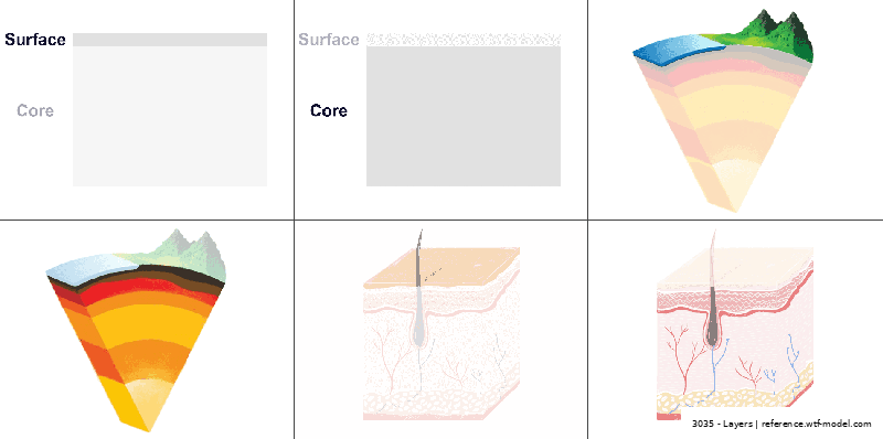 Layers refer to the different levels of an object or concept, with the core representing the essential elements and the surface being the outermost layer.
