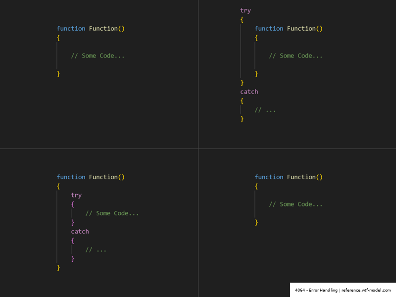 No try-catch: Fast, simple, but exceptions bubble up. Full internal try-catch: Local control, slight overhead, robust. External try-catch: Clean method, caller handles, flexible but risks inconsistency.